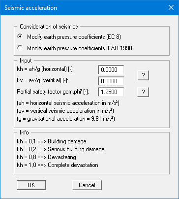 Seismic loads can be taken into consideration as described in EC 8 or EAU 1990, Section 2.14, by increasing the active earth pressure coefficients and reducing the passive earth pressure coefficients. Seismic loads are given in multiples of gravitational acceleration (g).