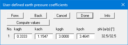 The earth pressure coefficients entered here are only adopted if the "User-defined" check box is activated in "Editor 1/Active earth pressure" and/or in "Editor 1/Passive earth pressure" menu items.