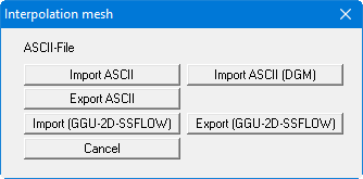 The x- and y-coordinates of the interpolation mesh can be imported from an ASCII file or exported for other applications. A dialog box as described in Section “Import ASCII file menu item” opens for the "Import ASCII" option.