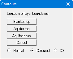 Define the type of contour diagram using the "Normal", "Coloured" and "3D" option buttons. Details are described in Sections “Normal contours menu item” to "Coloured menu item”. Exit the dialog box by clicking the button for the layer for which the contour diagram is to be displayed.
