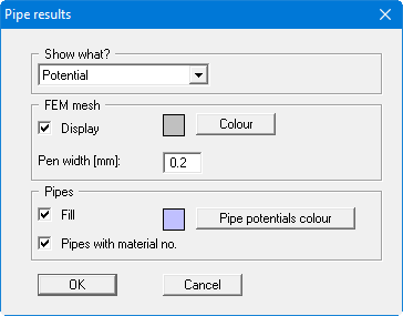 If you have defined pipes with material numbers using "Boundary/Define pipes" you can display the results using this menu item. First, a dialog box opens for selecting between display of potentials, gradients, velocities or discharges.