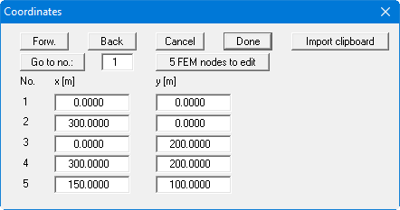 Select the "Via a table" button and the "0 FEM nodes to edit" button in the following dialog box. Enter 5 as the new number of FEM nodes and confirm the input. Then enter the five coordinate pairs in the table.