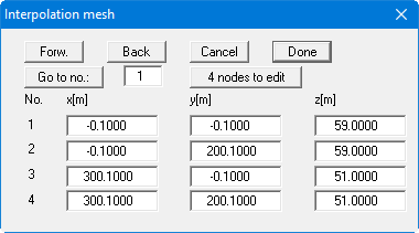 By doing this, you define the four points of the interpolation mesh. A small surcharge of 0.1 was used, with reference to the corner nodes of the FEM mesh, in order to ensure that the FEM mesh is completely enclosed. With the z values you define the gradient of the base of the aquifer.