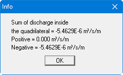 Go to the "Evaluation/Discharge" menu item. Accept the display preferences and exit the dialog box using "OK". The system is now displayed with discharges. Using the rectangle, trace around the nodes on the water side that are labelled with a discharge. The sum of the discharges is displayed in a message box.