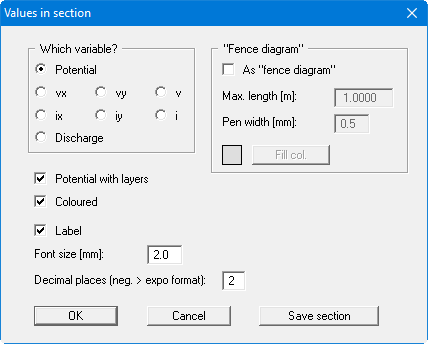 You can define preferences for the section as a function of the selected variable, for example labelling or a display of a fence diagram. If you have selected "Potential", you can also choose to have the layers displayed, as well as the potentials.