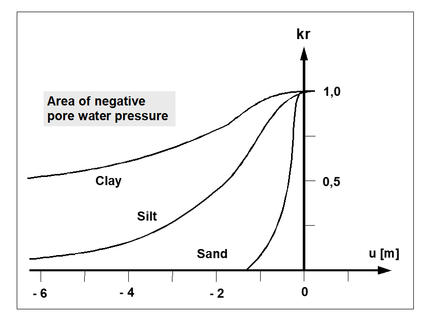 The value kr records the change in permeability in the unsaturated zone r, above groundwater, and can take on values between 0.0 and 1.0. In the saturated area of the system kr is 1.0. The value kr is a function of the pore water pressure u. The pore water pressure u is calculated from the piezometric head h, the elevation head y and the unit weight of water w.