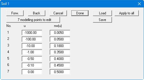 The table offers you the possibility of developing the specific soil curve of the soil to be processed by assigning various pore water pressures u to nw values. By clicking on the "x modelling points to edit" function box you can edit the number of modelling points. The entered values are adopted for all soil layers after an additional confirmation if the "Apply to all" button is clicked.