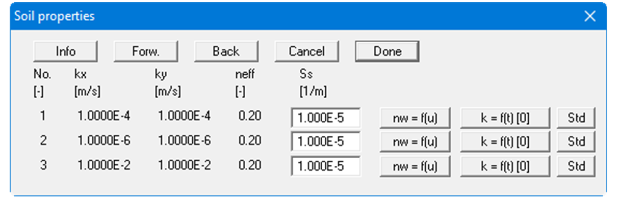 The soil permeability can be altered as a function of the time using the "k = f(t) [0]" button.