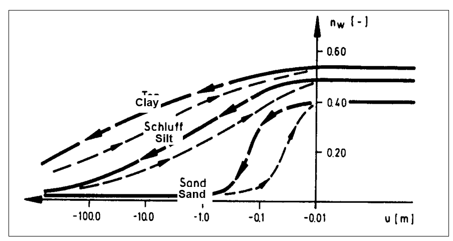 The value for nw can also be entered here. The value of nw gives the volume of water relative to the total volume. It is a dimensionless variable and is a function of the pore water pressure u. Typical function curves for various soil types are shown in Figure 1: