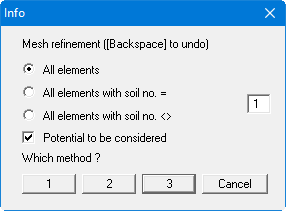 Either all elements or only element with certain material numbers can be refined. Here, too, potential boundary conditions can be taken into consideration (see "Mesh(x/y)/Refine individually" menu item). A description of the 3 refinement methods can also be found in that Section.