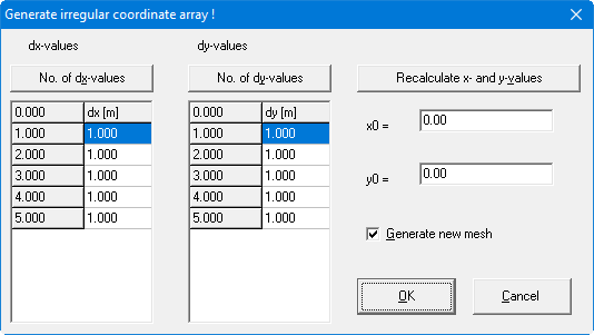The array numbers can be defined using the "No. of dx values" and "No. of dy values" buttons. Enter the array spacing in "dx" and "dy". If you press the "Recalculate x and y values" button the first column to the left of "dx" and "dy" are recalculated. These are absolute values for the array. The array origin is entered in "x0" and "y0".