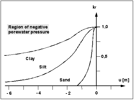 The value kr records the change in permeability in the unsaturated zone r, above groundwater, and can take on values between 0.0 and 1.0. In the saturated area of the system kr is 1.0. The value kr is a function of the pore water pressure u. The pore water pressure u is calculated from the piezometric head h, the elevation head z and the unit weight of water