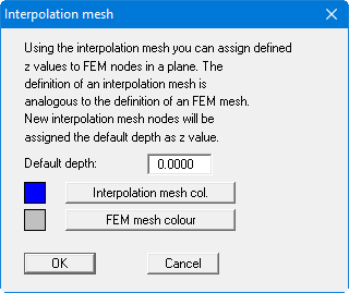 In principle, the z values can be completely defined using the previous menu items. A further defining simplification is offered by the interpolation mesh. Similarly to the FEM mesh, this interpolation mesh consists of nodes and triangles. A certain z value can be defined at the nodes. After defining an interpolation mesh you can assign the z values to the user-defined plane of the FEM mesh. These are assigned by means of linear interpolation. The interpolation mesh should (but not must) completely blanket the FEM mesh. In the simplest case possible, this may consist of one triangle.