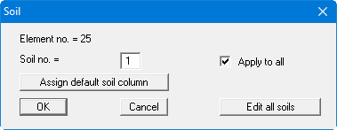 Here, you can assign the active layer a different soil number. If the "Apply to all" check box is activated this soil number will be used for all layers of this FEM element. You can assign the respective layers different soil numbers using the "Edit all soils" button.