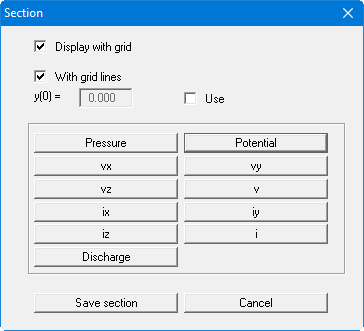 After clicking the parameter to be visualised the values along the defined section will be displayed graphically. You can save the previously defined section to a file. It can then be opened again if you return to this menu item. If you used this menu item immediately preceding this point, you can also open the last section using the "Prev. section" button.