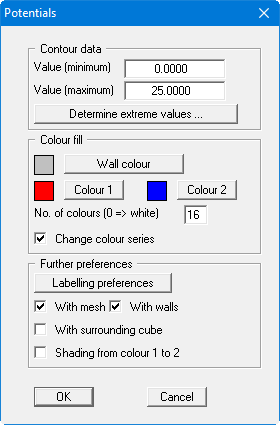 Using this menu item it is possible to visualise lines of equal water level (potentials) for the existing nodes in three dimensions. In the following dialog box you can choose between perspective and parallel projection, as well as selecting the position of the eye.