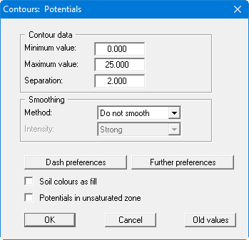 You can visualise lines of equal water level (potentials) using this menu item. You will see the following dialog box, in which you can specify the type of presentation.