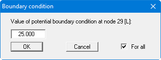 In the dialog box you define the value and type of boundary condition. If the "For all" check box is activated the boundary condition at this point is adopted for all planes. However, please observe the remark above.