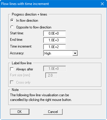 In the following dialog box the modelling parameters and the type of subsequent presentation can be confirmed or edited. Activate the "Opposite to flow direction" check box in order to retrace the path of a particle.
