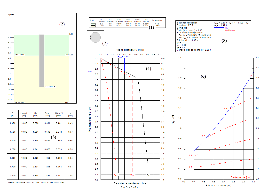 Pile diagram (6) with analysis results for allowable pile loading and settlements,