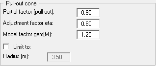 If a "Tension pile" has been selected, information on the groundwater level is required for analysis. An additional "Pull-out cone" group box is shown in the dialog box, where you may enter the "Partial factor (pull-out)", the "Model factor gam(M)" and the "Adjustment factor eta".