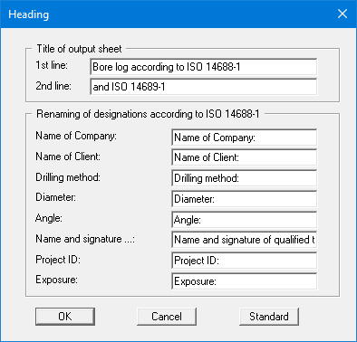 For a bore log to ISO 14688-1 the information on the borehole and the project given in the dialog box are displayed on the form. This menu item also allows modification to the input box designations. Data input is made in the menu item "Edit/Additional data".