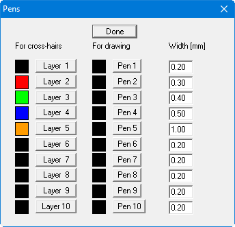 The pen widths are entered in the width column. The pen colours can be defined after clicking the "Pen 1", "Pen 2", etc. buttons. Any objects already drawn are not affected by subsequent changes.