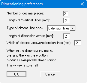 The number of decimal places can be specified in the top line; they are shown on the screen fir subsequent dimensioning. If "Extension lines" are used as the type of line boundary, the extension lines are drawn normal to the dimension lines; their length can be defined.