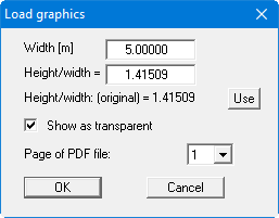 The size of the image can be altered using "Width" and the ratio "Height/Width". The height/width ratio of the original can be read off below the height/width input box. In order to import an undistorted image click on the "Use" button to the right. If the "Show as transparent" check box is activated the graphics are translucent, i.e. underlying lines or colour fills remain visible. If you import a PDF file as a graphic, you can define which page of the PDF document is shown.