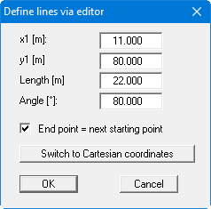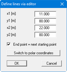 Enter the respective x- and y-coordinates of the start and end point of the line. Activate the "End point = next start point" check box to created a polygon course. After confirming your input the defined line is drawn on the screen. If you go to this menu item a second time the old end coordinates are adopted as start coordinates.
