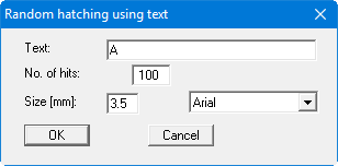 In analogy to hatching using lines, areas of the drawing can be filled by text (also see menu item "Special/Random hatching"). The text is distributed randomly in the defined area (polygon course). The default settings for random hatching are made in the dialog box for this menu item: