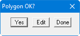 If you answer the original "Polygon OK?" prompt with "Edit" the selected polygon course can be extended or adopted lines removed from it by clicking further line objects. Changes to the default preferences can also be made at this stage. Let the program know you have finished editing work by right-clicking with the mouse. The above mentioned "Polygon OK?" prompt appears followed by visualisation on the screen. A further prompt appears: