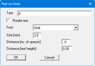 The text is repeated at regular intervals along the selected lines. The text is rotated by 180° using the "Rotate text" check box. In addition, the font and font size can be adapted. The input following "Spacing [number of spaces]" determines the distance between the repetitions. The input following "Spacing [text height]" defines the distance of the text from the line as a multiple (fraction) of the text height.