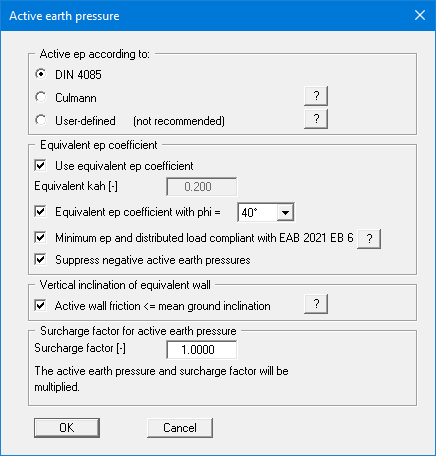 The "Use equivalent ep coefficient" check box should only be deactivated in exceptional circumstances (see EAB R 4). The equivalent earth pressure coefficient can only be smaller than 0.2 in special circumstances (see EAB R 4). It only makes sense to deactivate this check box when re-examining existing analyses (for instance, all the examples used in the Piling Handbook). Alternatively, the equivalent earth pressure coefficient can be defined by means of a friction angle phi = 40° or 45°. This procedure also takes the defined wall friction angle into consideration.