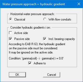 The cantilever walls of an excavation in flowing groundwater will experience increased earth pressure on the active side and decreased earth pressure on the passive side. In accordance with EAB R 63, the effect on the active side can generally be ignored, while the effect on the passive side must always be taken into consideration. You can make the appropriate selection in the bottom dialog group box.