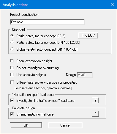 If you select the "Use absolute heights" check box, you can enter all depths or heights in m AD (heights are positive upwards). If you leave this box unselected, the top of the wall is assumed at 0.0 m (height/depth) and all input of layer depths etc. is positive downwards. If, however, you want to work with absolute heights, enter the appropriate depths correspondingly altered. Thanks to WYSIWYG there is no danger of using incorrect data since all input is immediately visible on the screen. In this example the check box "Use absolute heights" is not selected.