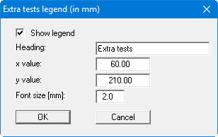 The legend heading is defined in the first input box. Labelling of the extra tests in the legend is specified in the menu item "Special/Define extra tests" (see Section 5.5.3). You can define and edit the position of the legend using the "x value" and "y value". The size of the legend is controlled using "Font size".