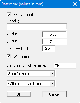 This legend is deactivated in the program default setting. If the "Display legend" check box is activated in the dialog box for this menu item, the element is displayed in the visualisation on the output sheet. A heading can be entered in this menu item's dialog box and the type of file name display selected. When using the "Complete file name" setting the file name is displayed with the complete path. You can define and edit the position of the legend using the "x value" and "y value". The size of the legend is controlled using "Font size".