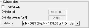 In the "Density" group box you enter the unit weights and the cylinder volumes for density determination. If a container database exists a "Cylinder data" group box is automatically displayed in the dialog box. If the "Individually" check box is deactivated the cylinder used can be selected from the drop-down combo box.