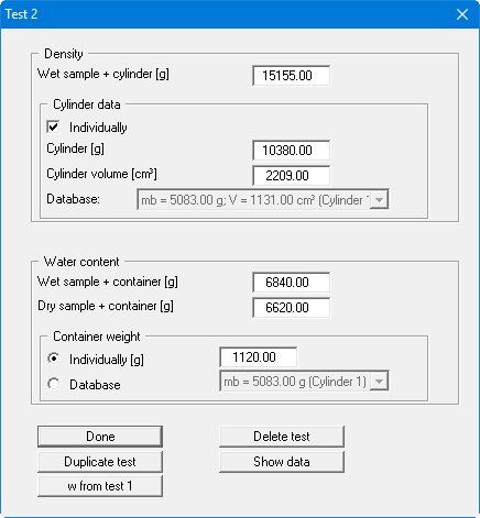 If the 2nd individual test was created using "Duplicate test", the water content can be simply increased by a user-defined difference by pressing "w from Test 1", without the need to enter the real data for wet sample, etc. Each subsequent test then refers to the previous test, i.e. the button for the 3rd individual test reads "w from Test 2".