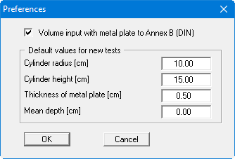 Enter the default values for the cylinder dimensions and for the metal plate in the dialog box. These data are adopted in the input fields in the editor boxes for the single tests in 'Edit/Tests'.