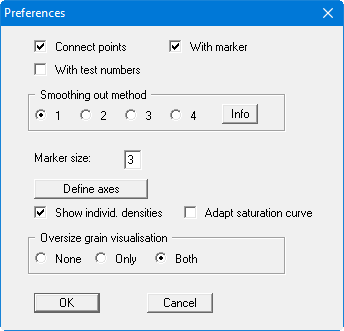 The program automatically selects a sensible axes scale for the visualisation of the Proctor curve. If you select the "Define axes" button you are first offered the automatic scaling values in a further dialog box, which you can then edit as wished. In addition, visualisation of the individual densities, zero air space curve and oversize grain component can be activated and preferences defined.