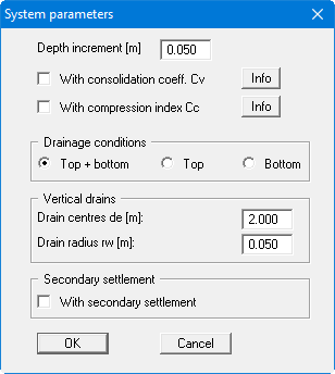 If you chose to employ a numerical solution method, you need only select general boundary conditions in "Edit/System parameters". Input of soil properties can be carried out by going to the "Edit/Soils" menu item. When you go to "Consolidation with both types (numerical)", the following dialog box opens