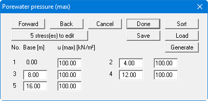 If you would like to edit the number of stresses, select the "x stresses to edit" button and then enter the new number of stresses. Using the "Sort" button, you can sort the stresses according to depth. This sorting is carried out automatically upon leaving the dialog box, without the function being explicitly called-up.
