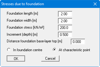 It allows you to generate the stress distribution of any footing foundation at either the characteristic point or at the foundation centre. The "Increment (depth)" input specifies the dept subdivisions at which the stresses are calculated. If the footing is located above the consolidating layer, specify the distance in "Distance foundation base-layer top [m]".