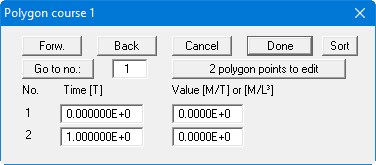 The temporally variable (transient) system boundary conditions for the system are defined using this menu item, or previously defined polygon courses may be edited. You enter the concentrations for the specified time intervals. Polygon course input is initially location-independent. Existing polygon courses are called up in the dialog box of this menu item using the button with the respective polygon course number