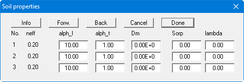 In the example above, three soils have been defined for the system (groundwater modelling with GGU-2D-SSFLOW). Enter the soil parameters relevant to contaminant transport in the input boxes: