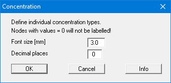 This menu item first generates a dialog box, in which you specify the font size and the number of decimal places. After confirmation you can click on nodes to which you want to assign an initial concentration (> 0.0) or a concentration source, using the left mouse button. A concentration source is constant over time.