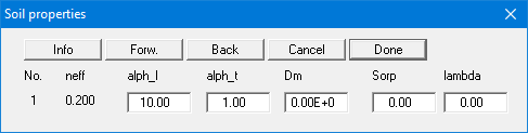 In the example above, one soil has been defined for the system (groundwater modelling with GGU-2D-SSFLOW). Enter the soil parameters relevant to contaminant transport in the input boxes: