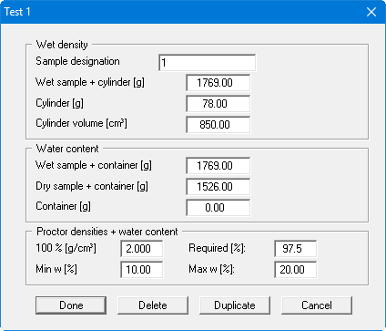 After clicking on "New" or on the button of an existing test a dialog box opens for entering or editing test data. The dialog that appears when the "Cylinder (proctor)" method is selected is shown below: